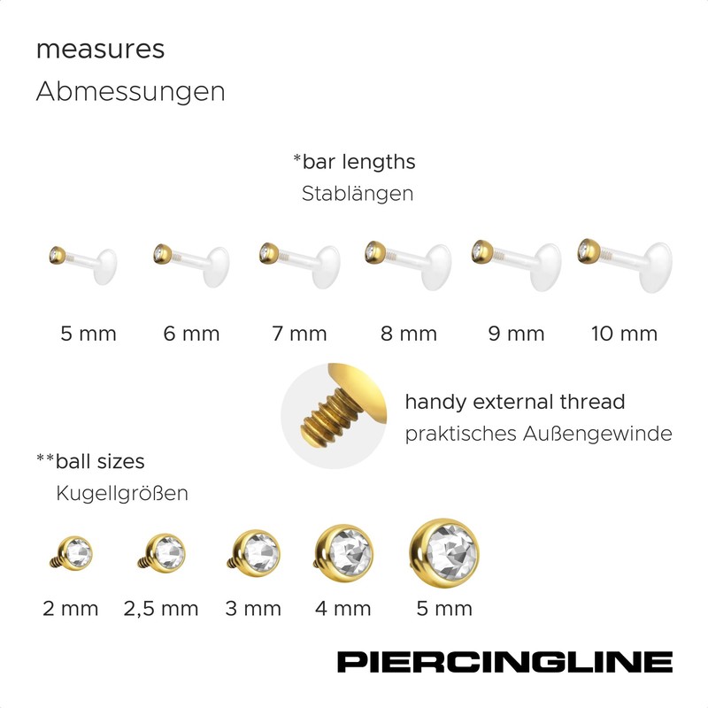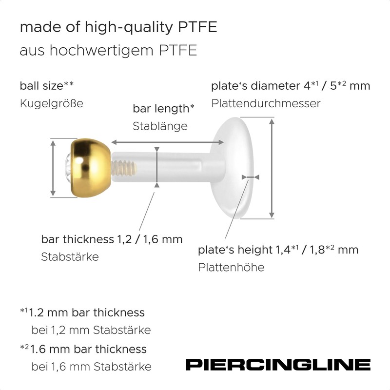 - Box contents: 1 PTFE labret plug + titanium attachment, silver, 2.5 mm ball size, 1.2 mm bar thickness, 10 mm bar length, 0.9 mm thread, crystal colour crystal clear, 1.4 mm height plate, 4 mm diameter plate