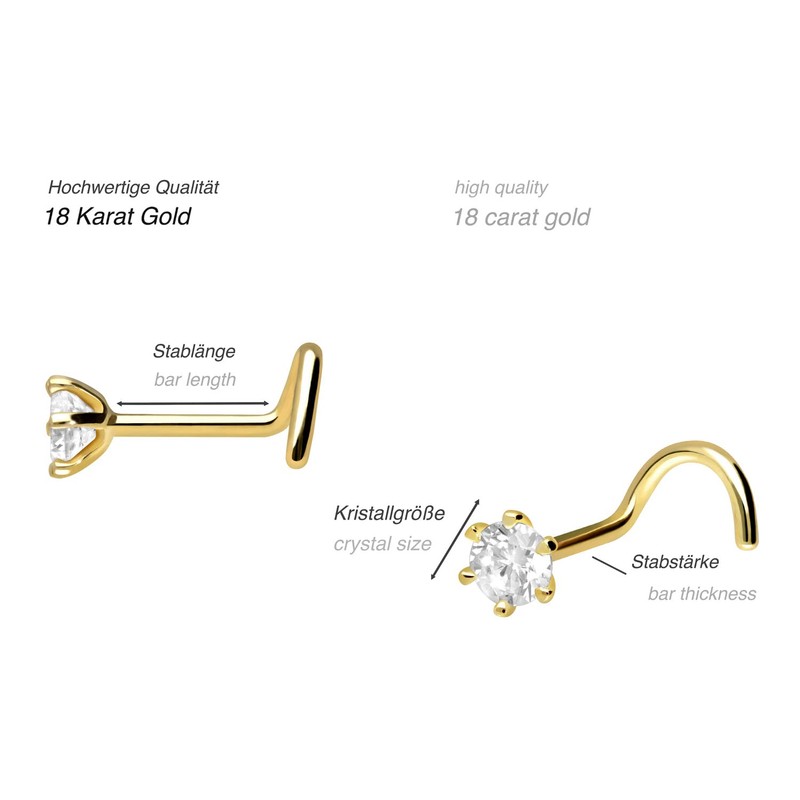 - Box contents: 1 nose stud | 750 white gold (rhodium-plated) 18 carat | bar length: 6 mm | bar thickness: 0.6 mm | crystal size: 3.5 mm
