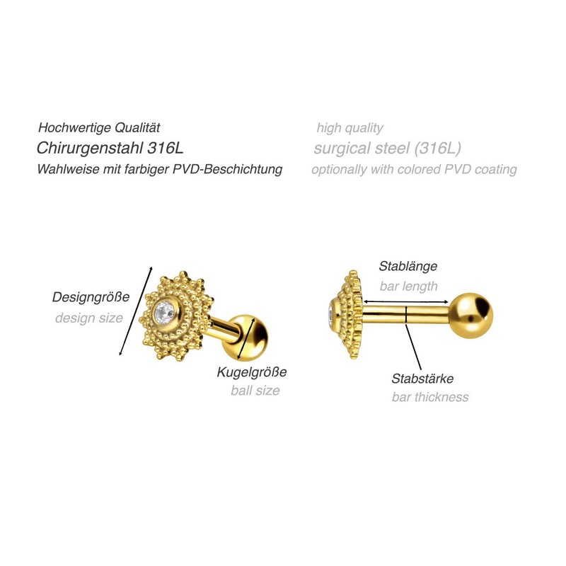 - Box contents: 1 surgical steel ear piercing, silver-coloured, 1.2 mm bar thickness, 6 mm bar length, design size (oriental design): 6 mm - 3 mm rear ball size