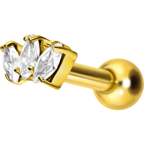 • Box contents: 1 titanium ear piercing, gold colour, 1.2 mm bar thickness, 6 mm bar length, disc size (3 crystal drops): 3 x 5 mm, ball size: 3 mm, thread: 0.9 mm