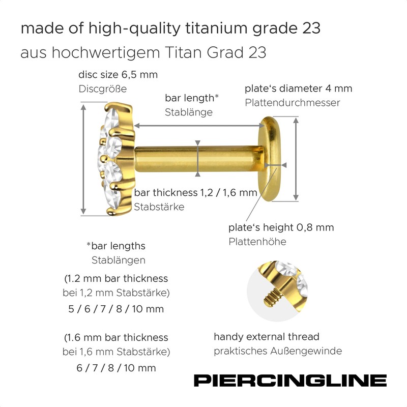 • Box contents: 1 titanium labret stud | gold coloured | 1.2 mm bar thickness | 10 mm bar length | disc size (crystal flower): 6.5 mm | plate height: 0.8 mm | plate diameter: 4 mm