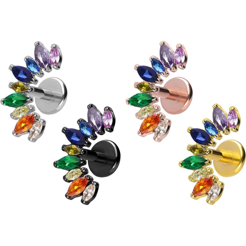 - Box contents: 1 titanium labret + titanium attachment (push fit without thread), gold colour, 1.2 mm bar thickness, 6 mm bar length, disc size (colourful crystal arch): 7.5 x 14.5 mm, height of the plate 0.8 mm, diameter of the plate 4 mm