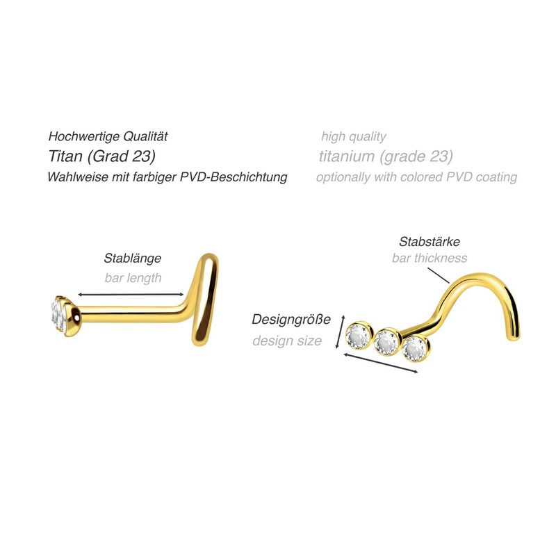 This stylish nose stud is made of high quality titanium, which is covered with a scratch-resistant PVD coating depending on the desired colour. In addition to the high quality, the material properties of titanium also include good skin compatibility and durability. A better grip in the nose is ensured by the spiral shape. As a special highlight, the beautiful piece of jewellery adorns three sparkling crystals. The nose stud has a bar thickness of 0.8 mm and a bar length of 6.5 mm. Material: titanium (grade 23) surface: highly polished / PVD coating material colour: gold / rose gold / black / silver crystal colour: crystal clear bar thickness: 0.8 mm bar length: 6.5 mm design size (3 crystals): 2 x 6 mm