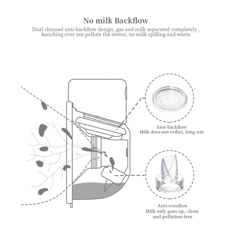 - A prueba de fugas: las características de diseño antireflujo en el diafragma de silicona hacen que la leche no se refluya, uso prolongado; las características de diseño antidesbordamiento en la válvula de pico de pato hacen que la leche solo suba, limpia y última intervensión de contaminación.