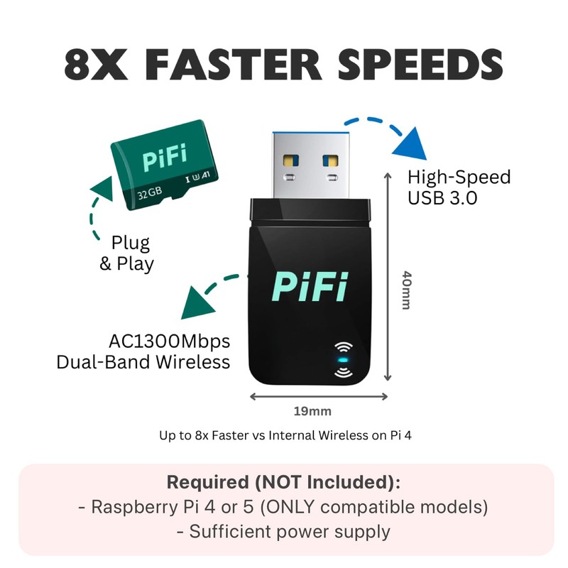 Pro Networking. Easy as Pi. Imagine in one hand you have a the world's simplest VPN router. In the other, you have a Raspberry Pi, one of the best selling computer devices in history. Now, put your hands together... PiFi  brings a highly-optimised version of OpenWrt to Raspberry Pi 4 and 5. The Raspberry Pi CPU lifts VPN performance. And the PiFi software alongside a 1300Mbps WiFi adapter turns it into an incredible VPN router. ★ You can easily connect to your favourite VPN provider by uploading a config file in just a few taps via the PiFi app. ★ Plus, AdGuard Home - for ad and tracker blocking - and network-attached storage (both using the SD card provided or a USB you connect) works out-of-the-box. No need for terminal, SSH or even LuCI (although they still work), PiFi has all of pro features you love from OpenWrt*, reimagined to be more capable, more simple and even more fun with an incredibly simple app —  optimised especially for Raspberry Pi devices. So blocking trackers and ads, connecting or switching VPN profiles and accessing your network-stored documents, photos or videos are now just a tap away on iPhone, iPad or Android from a easy-to-use app. Raspberry Pi may never have been designed with networking in mind. But PiFi has been crafted for Raspberry Pi. Comparison with Regular OpenWRT:- Powerful iPhone & Android app for easy setup and management- AC1300Mbps USB 3.0 WiFi Adapter Support (up to 8x faster wireless)- At-a-glance LEDs for VPN status- AdGuardHome- USB-to-ethernet adapter support- Auto-mount SD card + USB drive storage- Auto-cooling fan- Auto-repair, physical factory reset and one-tap restore***✔ NETWORK - Customize network settings, create a travel router, and more with just a few taps✔ WIREGUARD & OPENVPN - Easily upload and manage multiple VPN profiles directly from your iPhone or iPad. Create VPN for ALL your devices in seconds✔ ADGUARD HOME - Block ads and trackers across your entire network with AGHome✔ NETWORK STORAGE - Easily expand your network storage capacity (USB storage, SSD, or SD Card) and access your files from anywhere on the network **COMPATIBILITY NOTICE**The only OS that is officially supported for the PiFi AC1300 USB WiFi Adapter is the official PiFi OpenWrt builds - a generic or third-party build of OpenWrt, or any other third-party operating system or hardware may not be compatible.**TRADEMARK NOTICE**Raspberry Pi is a trademark of Raspberry Pi Ltd, AdGuard and AdGuard Home are trademarks of Adguard Software Ltd,  "WireGuard" is a registered trademark of Jason A. Donenfeld,  OpenWrt is a trademark owned by Software Freedom Conservancy (SFC). All other trademarks and copyrights are the property of their respective owners. PiFi firmware, software, and accessories are developed by PiFi Ltd, an independent project.