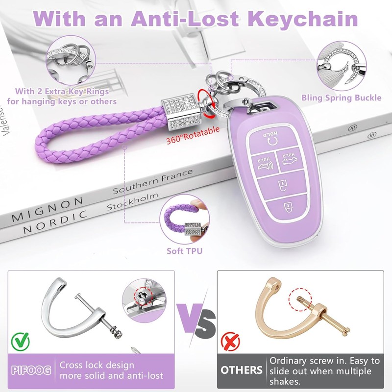 Anti-Lost Keychain: The D-shaped ring with a cross lock is more secure and locks tighter compared to the traditional spiral type, preventing keys from falling off or getting lost. PIFOOG's purple key fob case fit for Hyundai adopts a fully enclosed design, which effectively prevents your key from being scratched, damaged, or wet.