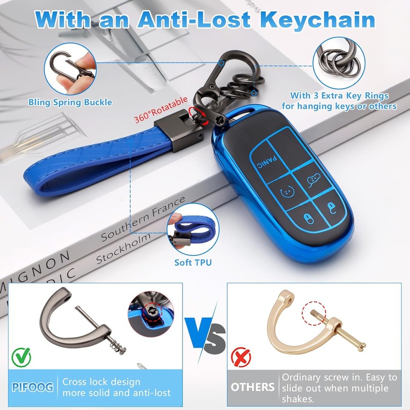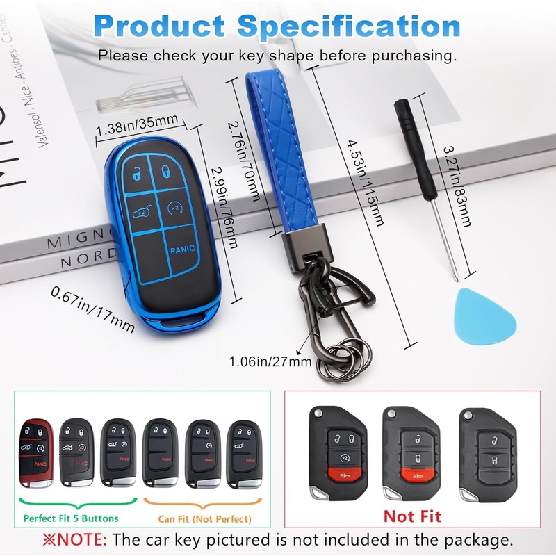 Specific for Jeep: PIFOOG TPU blue car key cover snugly fit for Jeep Grand Cherokee 2014 - 2021, Cherokee 2014 - 2023, Compass 2017 - 2024, Renegade 2015 - 2023, Also fit for Dodge Challenger 2015 - 2023, Charger / Chrysler 300 2011 - 2023, Durango 2014 - 2023, Journey 2011 - 2020, Dart 2014 - 2016, Viper / RAM 2500 3500 Laramie 2013 - 2017, Chrysler 200 2015 - 2017. (Tips: Pls confirm your car key shape and button patterns same as pictured before purchase.)