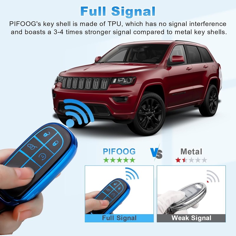 Full Signal: The lightweight and thin TPU material ensures worry-free signal transmission and does not interfere with your smart remote start key for Jeep. The signal strength is 3-4 times stronger than that of metal key shell.