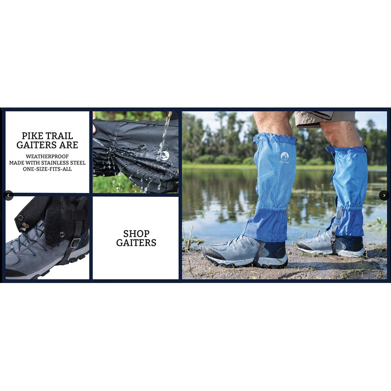 - PROTECTION; Pike Trail’s gaiters for men and women offer incredible protection from the elements; Engineered to guard against mud, debris and snow, our gaiters for hiking waterproof model even stops water entering your boot; When you need waterproof boot covers for men and women, Pike Trail is the smarter choice
