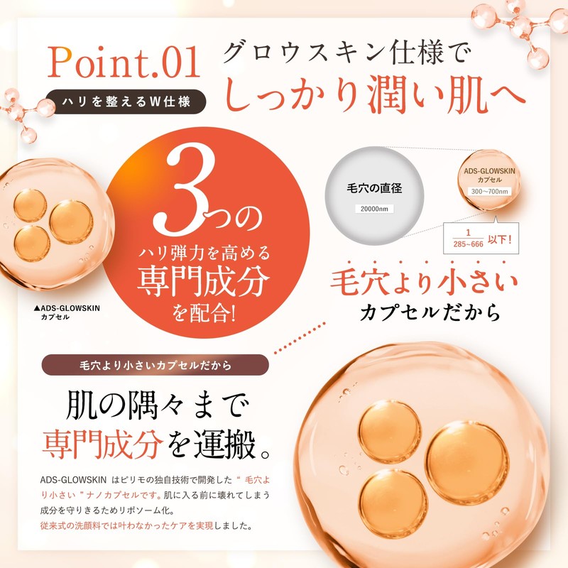 - (Penetrating System "Glowskin Formula x 1") has been developed independently for ads liposome capsules smaller than pores. The 3 biochemical ingredients are tightly packed into the capsule to increase firmness and elasticity to penetrate the depth of the skin to *2. *1 Lipo Capsules that collapse after reaching the square layer. *2, up to the stratum layer