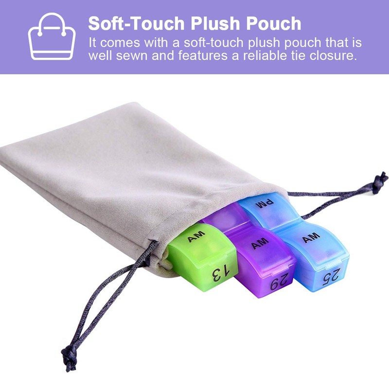 - Pill Box 1 Month 2 Compartments Our pill box 1 month comes with a soft grey plush bag. You can take out the day compartment and put it in the grey plush bag for convenient carrying on the go.