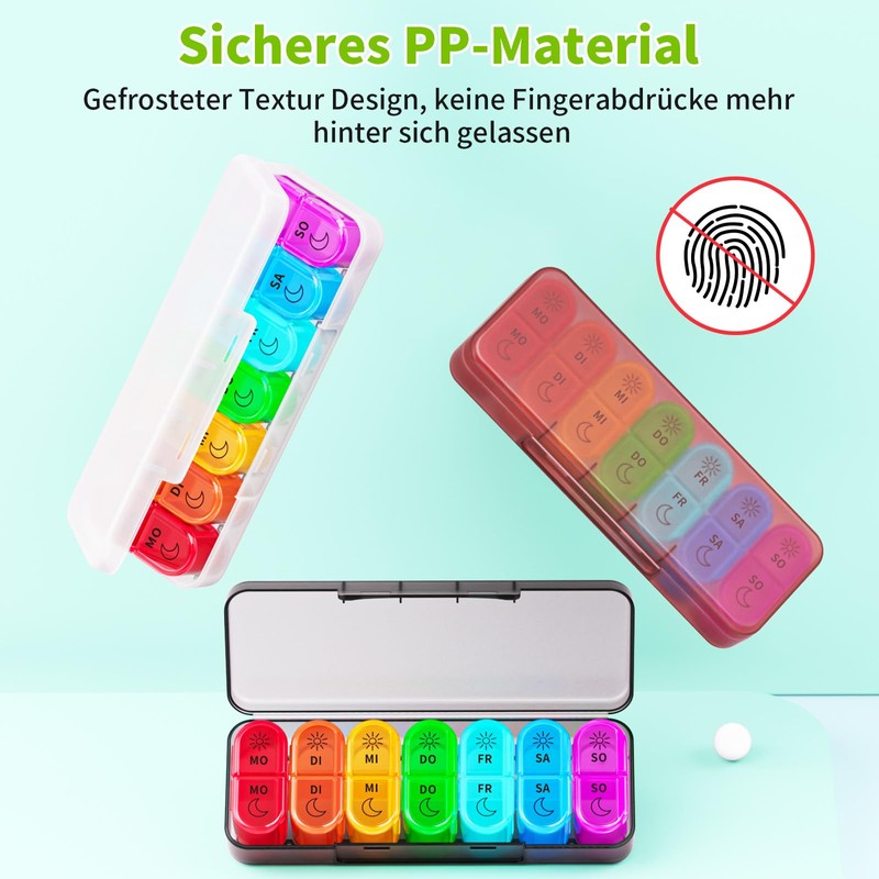 - Matte design and safe material: This 14 compartment pill box is made of food grade PP plastic, BPA-free, safe, non-toxic and odourless. The matte design looks good and leaves no fingerprints.