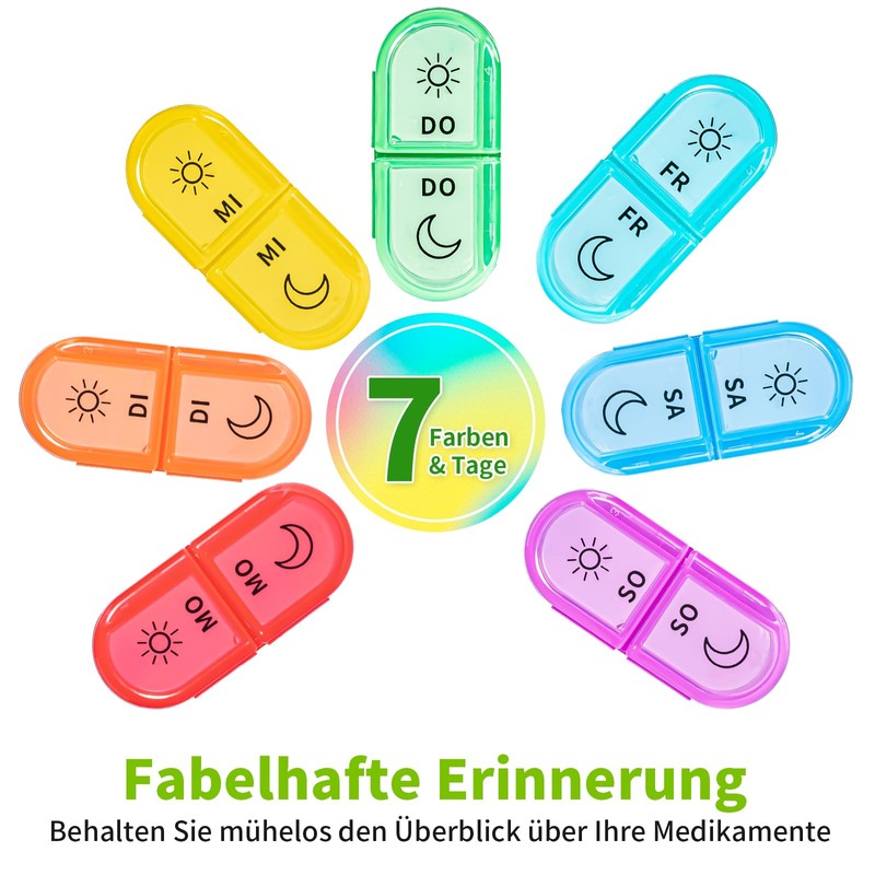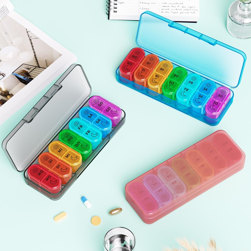 - Easy to use and remember: 7 small, easy to open pill boxes with a 180° opening for filling your medication. A different rainbow colour every day to clearly remind you that it's time to take your medication at the right time.