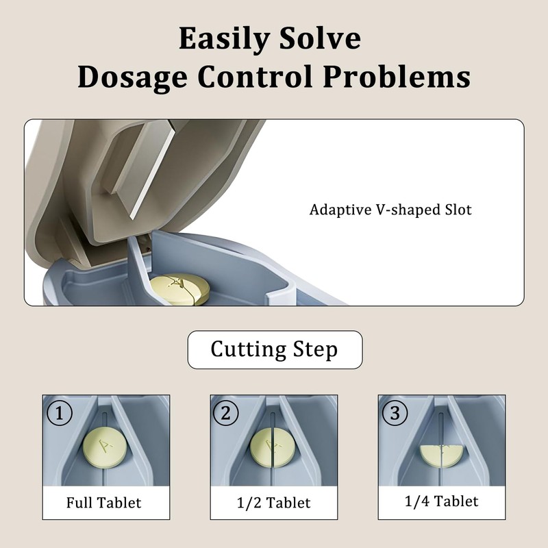 - Auto-Centering V-Slot - Self-adjusts for round/oval/heart-shaped pills, always perfect 1/2,1/4 pills