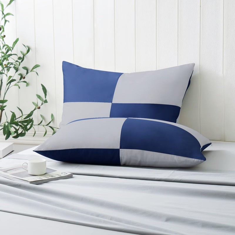 Pillow Cases Queen Size, 600 TC 100% Cotton Patchwork Queen Size Pillowcases Size Set of 2, Breathable Soft Cooling Pillow Covers for Home/Hotel (Grey & NavyBlue