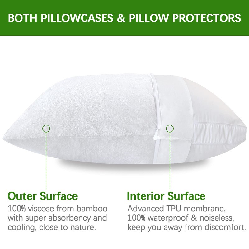 1.BOTH A PILLOW PROTECTOR & PILLOWCASES pillow protector; WATERPROOF & NOISELESS pillow protector; 100% NATURAL BAMBOO SURFACE pillow protector; SAFER & DURABLE DESIGN pillow protector; EASY CARE & GUARANTEE pillow protector. 2.IMPORTED