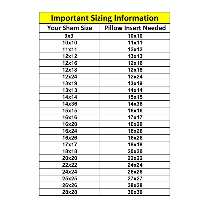 **Finally! Quality craft pillows that are worthy of being stuffed into your beautiful pillow sham covers Impress your Friends and Family, this pillow is made to look great in your shams!** Great Loft - We start by using high loft American made filler to give the pillow a full plump look that will last years! This is not a wimpy pillow you would find in a big box store No lumps – We use a slick polyester fiber to keep the pillow’s filler smooth. Unlike cheap pillows that use dry fibers that will quickly lump up and need replacing Hypoallergenic – This pillow is hypoallergenic, odorless, lint and dust free, free of flame retardant chemicals Covering – We use an American made pillow shell from a high thread count poly cotton blended fabric, that is durable and machine washable (cover is not removable) Made in USA **Where to use** Use as an insert in decorative shams Couch shams Bedroom shams Crafting Anywhere you need a pillow! Intended for indoor use **Care** Machine wash cold Tumble dry on low Fluff as needed **Sizing** Start by measuring your shams, pull tight along the outer seam and measure corner to corner, this should be done for all sham even if marked Please note your insert must be larger than your sham to correctly fill the corners of the sham and give them a nice even look. Small shams 10” to 17” typically need inserts 1” larger. Larger shams 18”+ typically need inserts 2” larger Please use yellow sizing chart in the images at the top left of this page for detailed sizing info