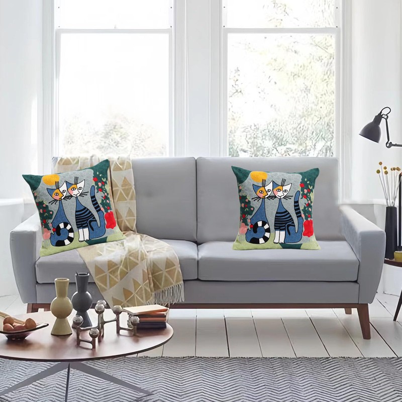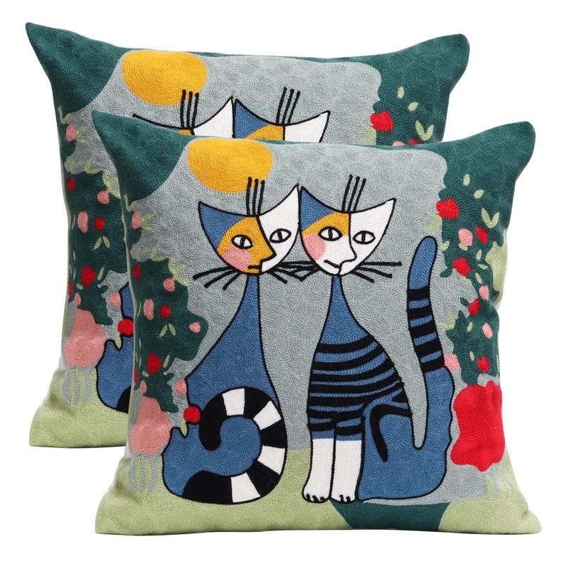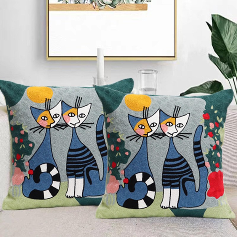 Pilmandu Pack of 2 Decorative Square Pillowcase Abstract Art Embroidered Throw Pillows Cover for Couch Farmhouse Patio Garden Sofa Chairs 18x18 Inch (Dating Cat)