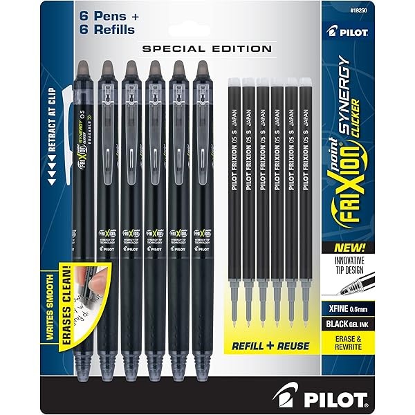 PILOT Frixion Synergy Clicker Erasable Pens, Retractable and Refillable, 0.5mm Extra Fine Point, 6 Pack of Black Ink Pens + 6 Refills