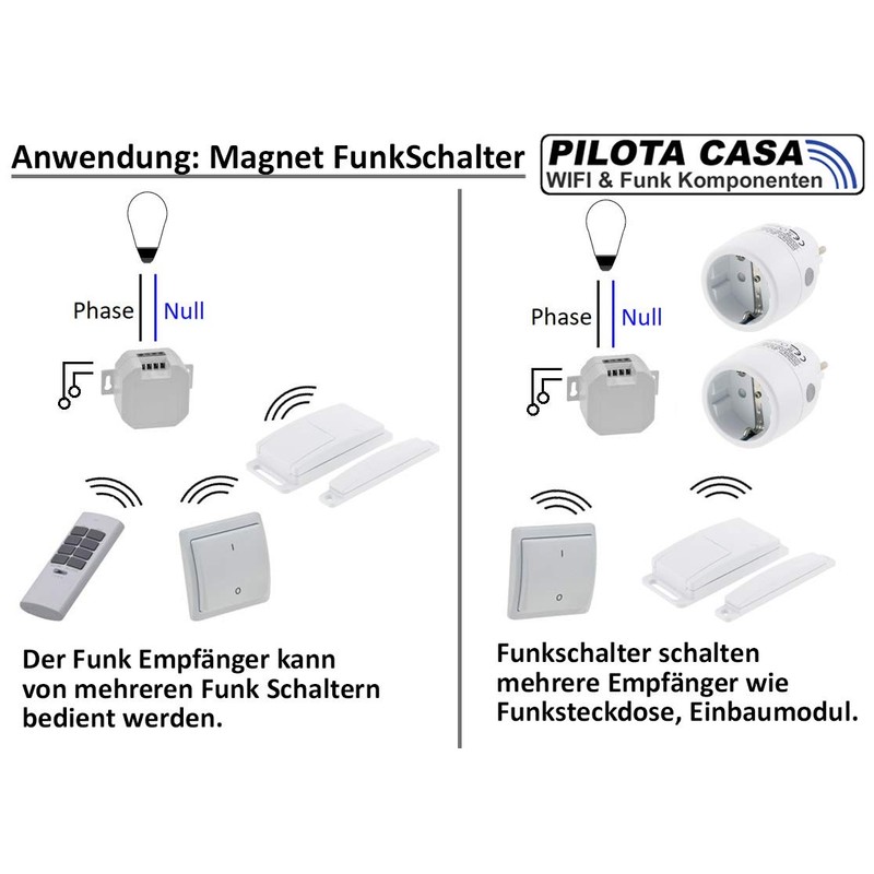 - Magnetic contact switch with built-in receiver in a ready-to-connect set for wireless exhaust air control and air supply in fireplaces, ovens, radiators, cooker hoods. The switching contact is also suitable as a circuit for lamps, lights, lighting and electronic devices. Radio receiver suitable for flush-mounted sockets.