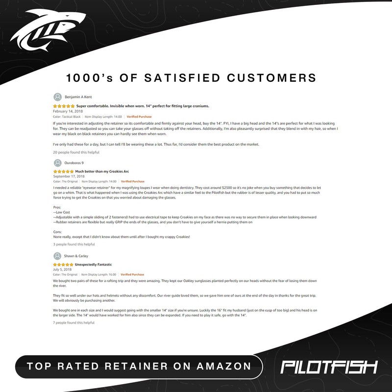 • SIZING AND SPECS: You’ll notice our retainer includes the Pilotfish Pro Connect. This connection helps protect your sunglass ends from being damage. We offer two sizes: 14 inches extended which retracts to 9 inches; And 16 inches extended which retracts to 10 inches.