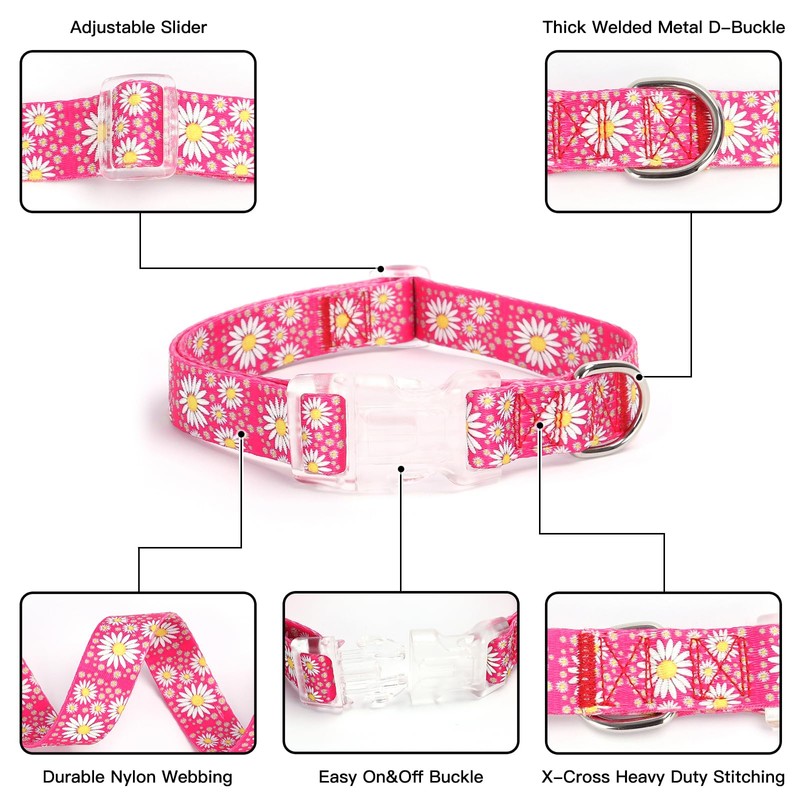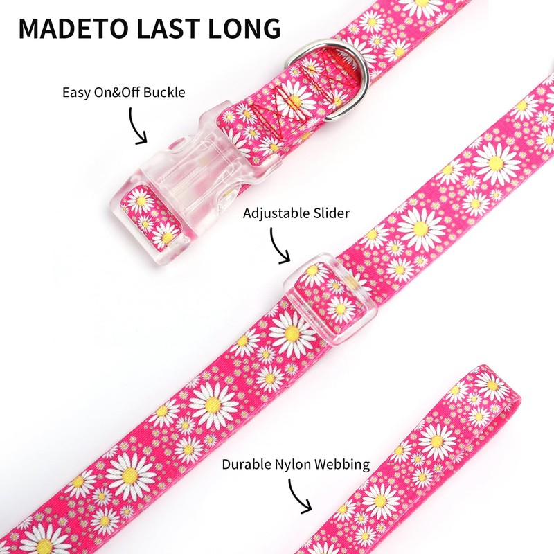- Stylish Design: This adorable dog collar features a vibrant pink background adorned with cheerful daisy patterns, adding a touch of whimsy to your furry friend's look.