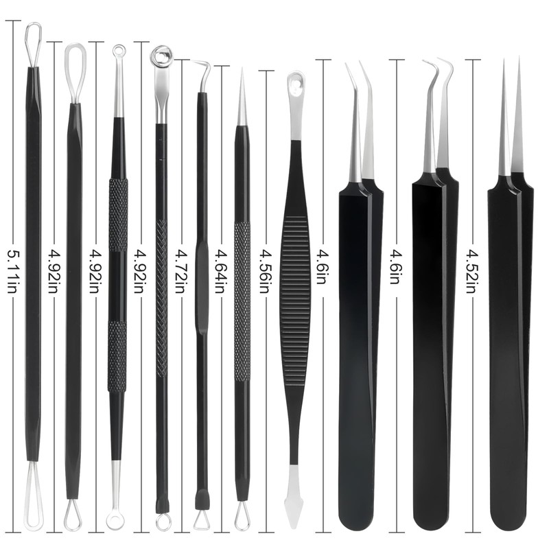 • 【Pimple Popper Tool Kit】10 different style blackhead remove tools can help us remove blackheads, acne and zit popping on your chin, cheek, forehead and nose easily, This blackhead extractor keeps your face clean and smooth in a much affordable way.