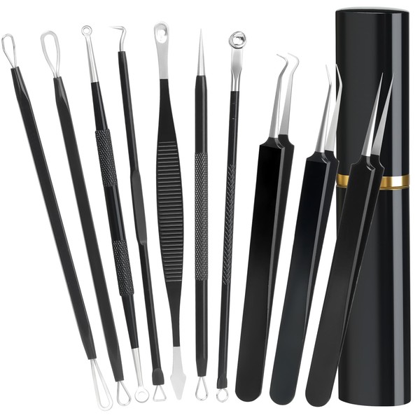 Pimple Popper Tool Kit,10 Pcs Professional Blackhead Remover Comedones Extractor for Easy Removal for Pimples,Blackheads,Zit Removing, Facial and Nose, Acne Removal Kit with Metal Box (Black)
