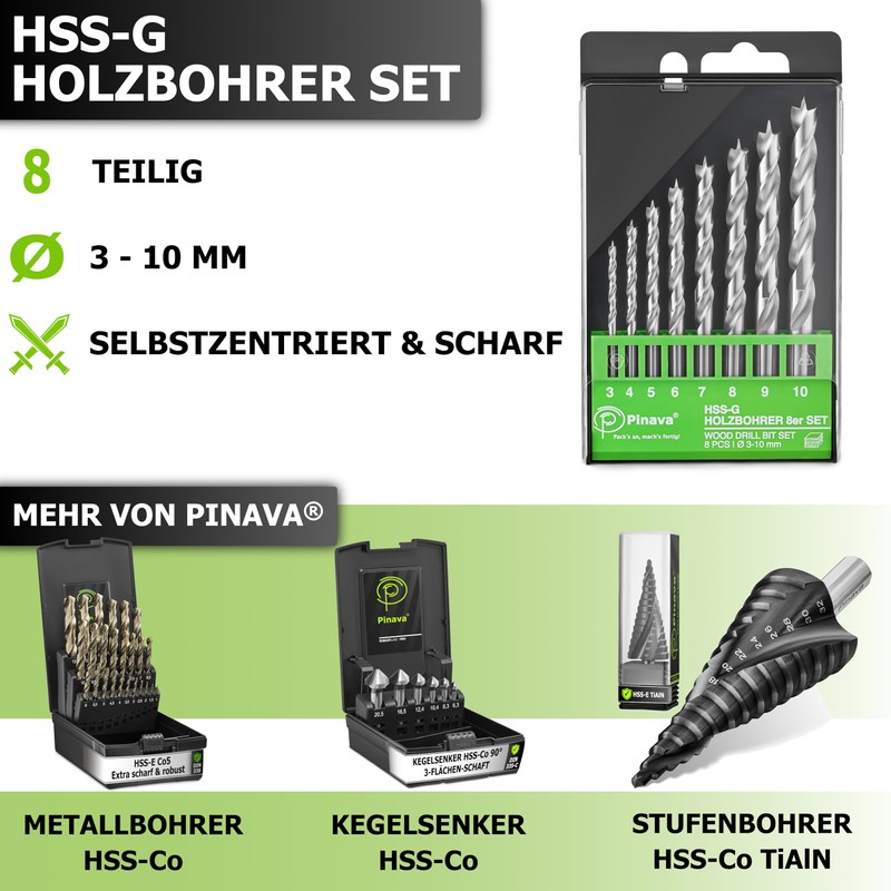 Pinava® Wood Drill Bit Set 3-10 mm [Continuous Sharp & Precise] HSS-G Drill Set - 8-Piece Drill Set Wood - Drill Set for Clean Drill Holes