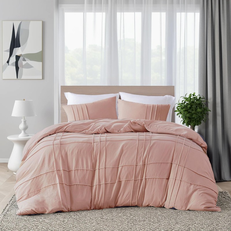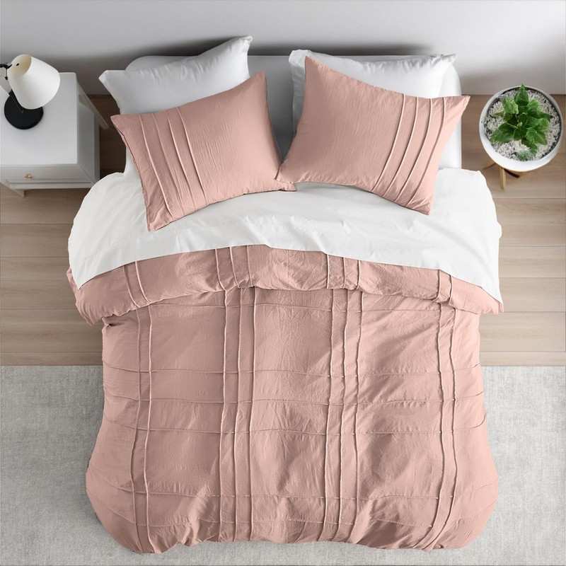 Pinch Pleat Comforter Set King – 3-Piece Bedding Set with Grid Pattern – Ultra Soft Pre-Washed Microfiber, Lightweight and Fluffy King Size Comforter Pink, All Season Warmth – Includes 2 Shams