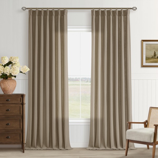 Pinch Pleated Linen Curtains 102 Inch Long Memory Shape Training Pleat Drape with Hooks Rings Back Tab for Living Room Patio Glass Door Modern Neutral Brown Dutch Cocoa Semi Sheer 102 Inch Curtain