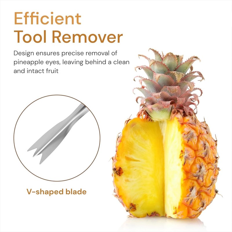- đăEfficient Designă: This Pineapple Eye Remover Tool features a V-shaped stainless steel blade that easily and precisely removes the tough eyes from pineapples, ensuring you can enjoy the fruit without any hassle.