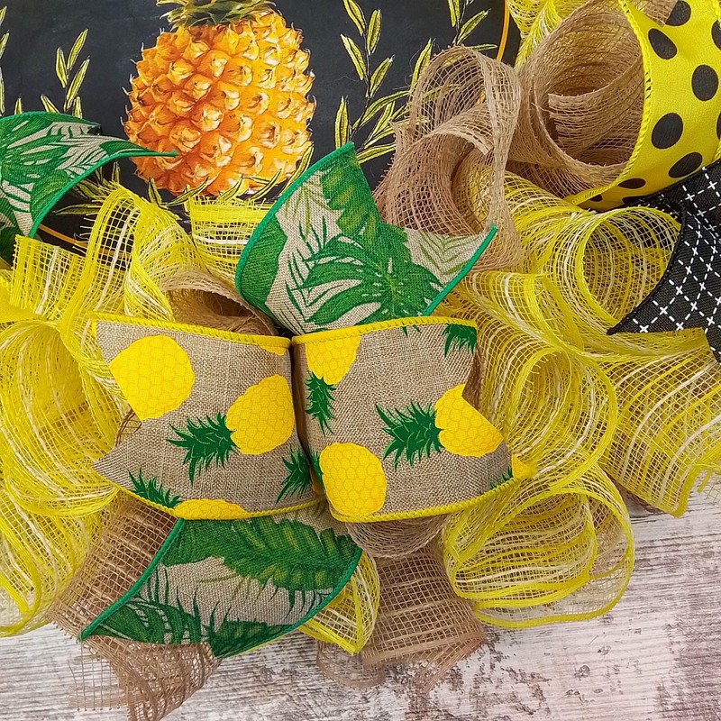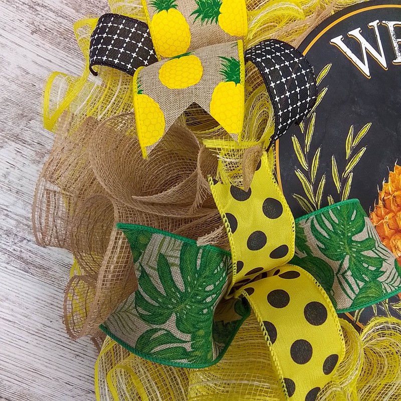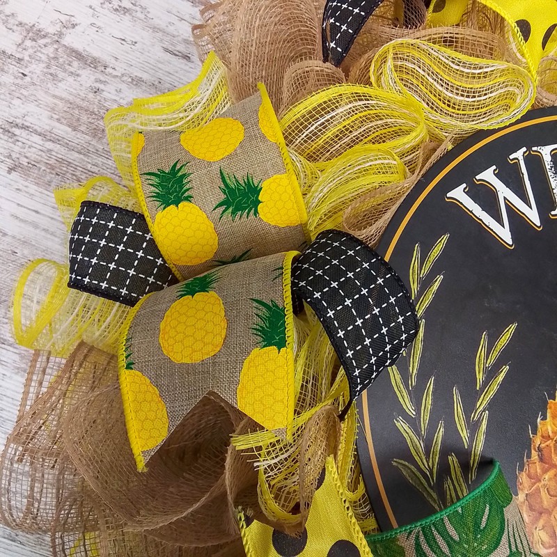 - This ready to ship wreath is made with yellow and jute mesh and accented with several coordinating ribbons to showcase the metal pineapple sign in the center (that is removable).