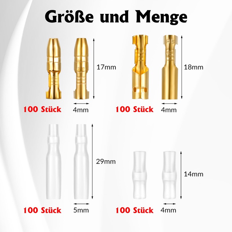 - 400 pieces cable lugs set: you will receive 100 flat sockets (male), 100 flat sockets (female), 100 insulated, 100 insulated sockets, suitable for cables with a cross section of 0.50 mm² to 1.50 mm², the quantity is enough for your use