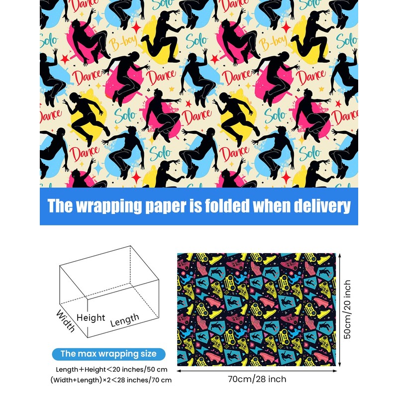 - STREET STYLE DESIGN: Our street dance wrapping paper is explosively printed with a range of cool elements: iconic breakdancing poses, classic boomboxes, turntables, and fresh dance sneakers. The bold and vibrant design captures the essence of hip hop culture, perfect for birthday parties, dance events, or adding an urban edge to any gift. Awesome supplies for gift wrapping, birthdays, dance classes, and more!