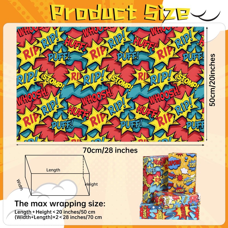 - 12 SHEETS:This comic-themed wrapping paper set includes 12 sheets total,with 3 sheets per design.Each sheet is pre-folded for compact storage and easy use.Ideal for birthdays,holidays,or special events,this pack offers variety and value,making it perfect for personal gifting or small businesses looking for eye-catching packaging.