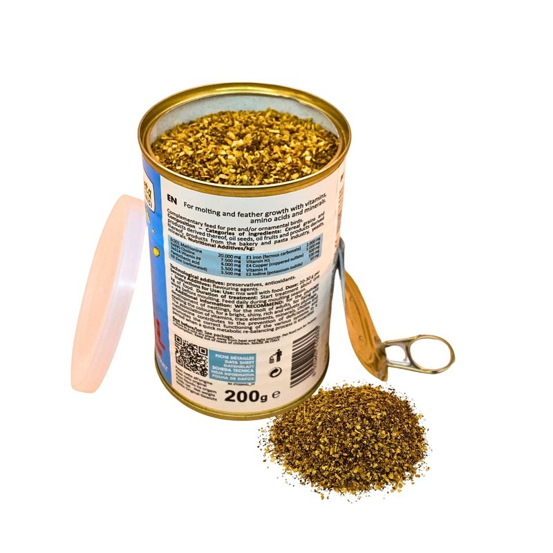 Designed to improve feather quality, stimulate rich and radiant plumage, and provide essential support during the molting phase—a critical period for bird health. Crafted with natural pigments and a blend of essential vitamins, VellBrill PINETA 200g guarantees top-notch quality and efficacy, ensuring that your birds receive the nutrients they need for optimal feather development and maintenance.