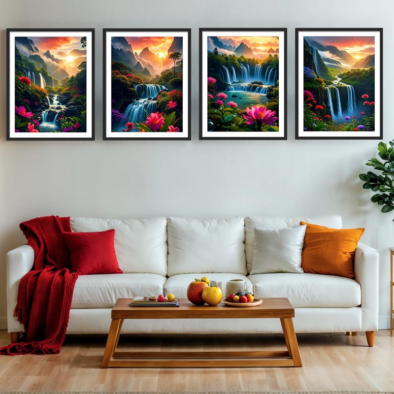 PINFFSHU 4-Pack Diamond Painting Kits for Adults Beginners: 5D Breathtaking Waterfall, Mountain Landscape with Floral Accents - DIY Full Drill Diamond Art Kits, Sparkling Home Wall Decor 12x16 Inches