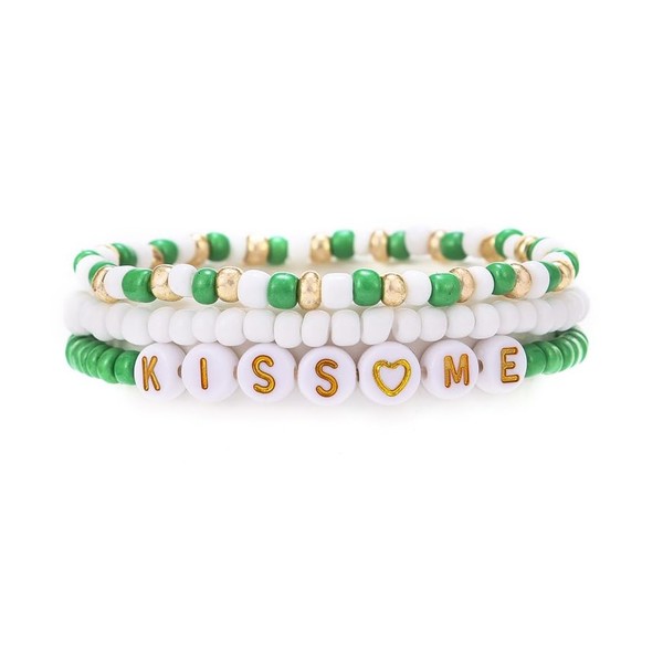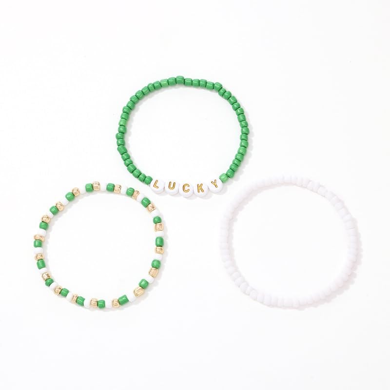 - St. Patricks Day Bracelets Set: A bright mix of layered bracelets made with green white acrylic beads and gold-tone sequins on elastic bands. Each set includes 3 stretchy, colorful bracelets that easily match any outfit
