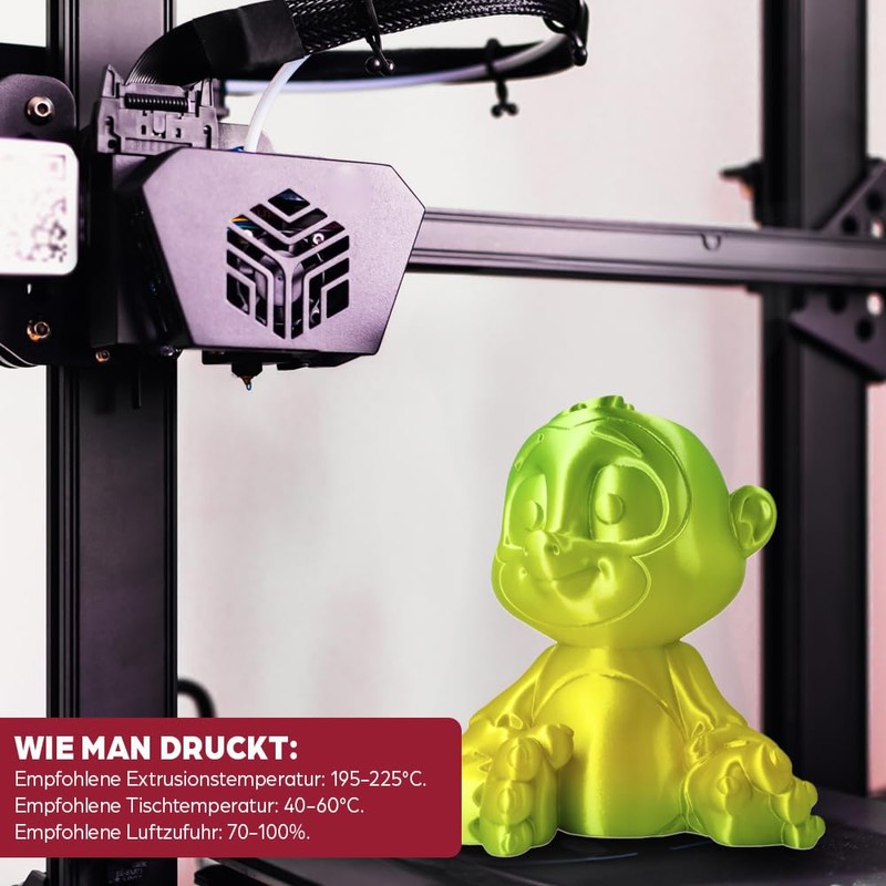 - Printing Parameters The filament can be printed on unheated tables. If you have any problems with adhesion, we recommend using a bonding agent. Recommended extrusion temperature: 195-225°C. Recommended table temperature: 40-60°C. Recommended air supply: 50-100%. If there are problems with the gloss, we recommend increasing the temperature or reducing the speed when contouring.