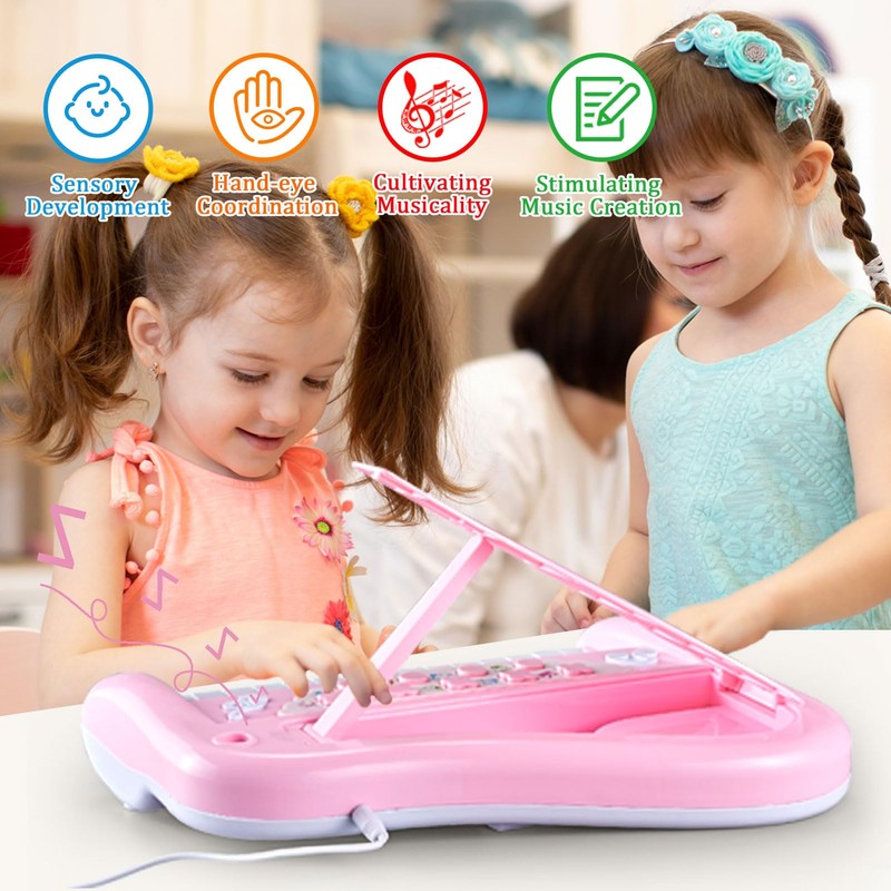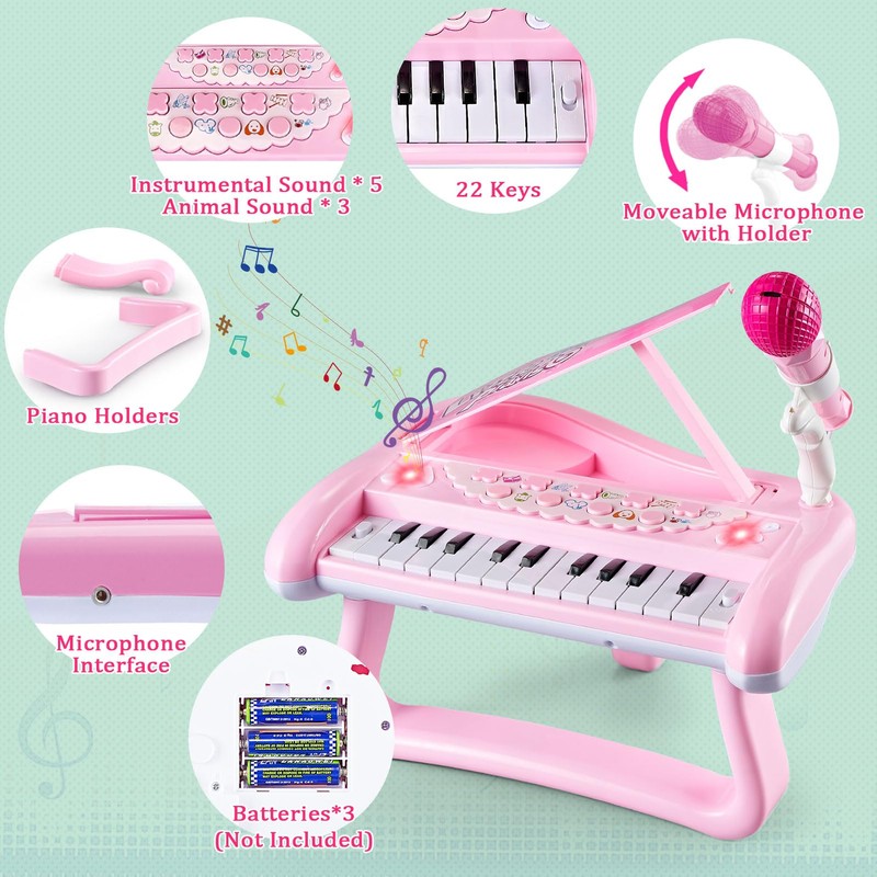 - Portable Multifunctional Pink Piano for Kids: this children's piano features 22 keys, 22 demo songs, 4 instrument sounds, 3 animal sounds, 1 clapping sound, volume control and 1 microphone. It is an ideal music toy for girls aged 3-5 years that stimulates children to explore different sound combinations. The realistic sound effects let them immerse yourself deeper into the world of music.