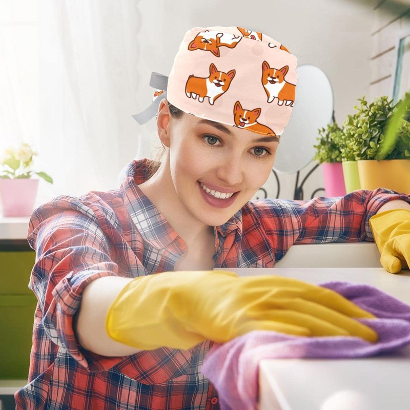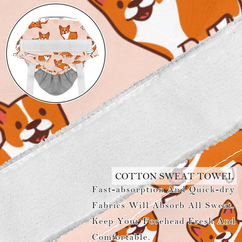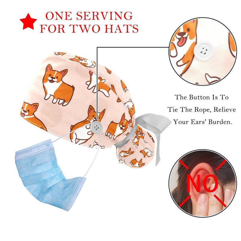 Pink Corgis Dog Scrub Hats for Women Long Hair, Working Cap with Button & Sweatband, Unisex Tie Back Hats 2 Packs