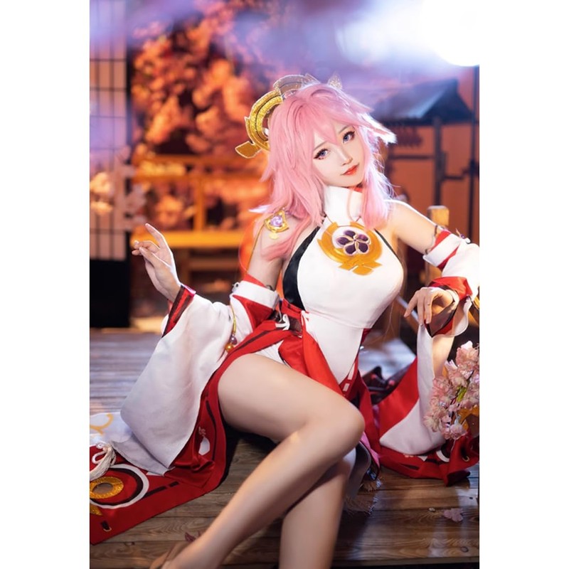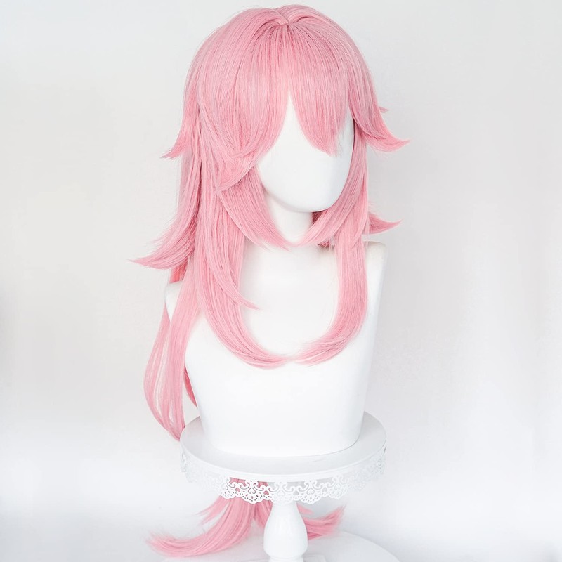 Pink Cosplay Wig for Yae Miko Long Anime Curly Sakura Straight Hair Wig with Ponytails for Halloween Party Include Cap…