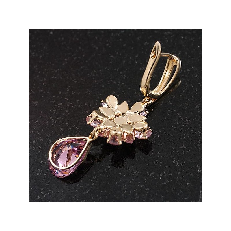 Pink CZ Floral Dangle Earrings in Gold Plated Metal with Leverback Closure - 50mm L