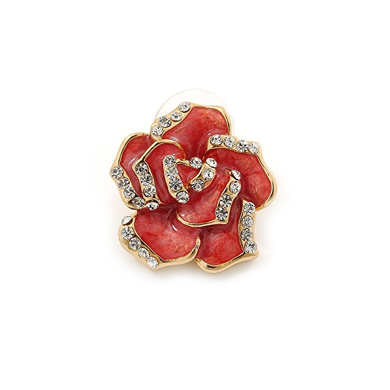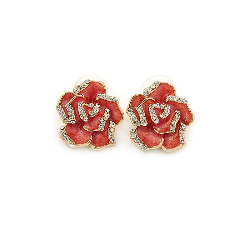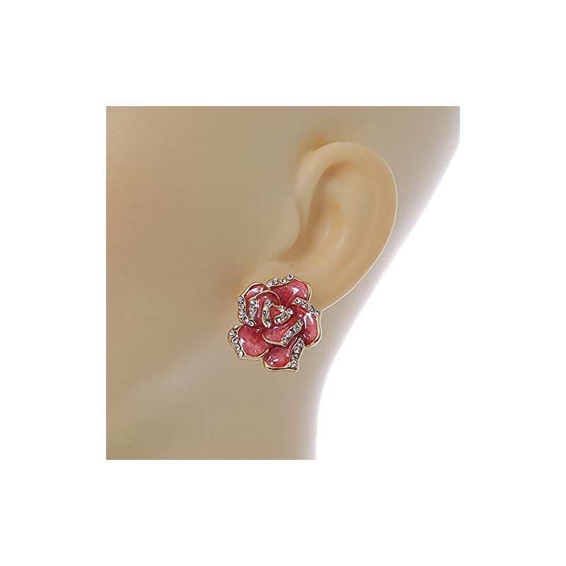 Pink Enamel Crystal Rose Stud Earrings In Gold Tone - 20mm Diameter