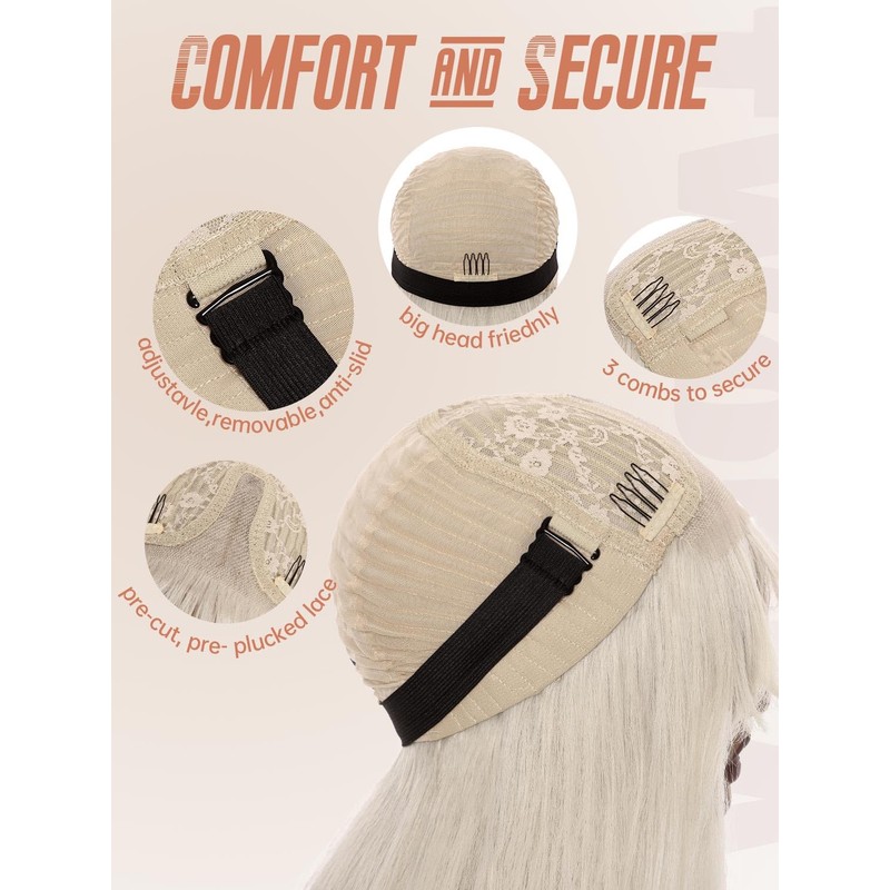 - Breathable Wig Cap Design:The long straight lace front wig with bangs features a 3D mesh breathable inner cap (medium size: 21-22.5 inches), designed to enhance air circulation and reduce heat buildup. The forehead lace netting ensures natural hairline integration and all-day comfort, while the adjustable elastic band allows for a customized, secure fit tailored to your head shape. Lightweight construction minimizes pressure and prevents slippage, ideal for extended wear.