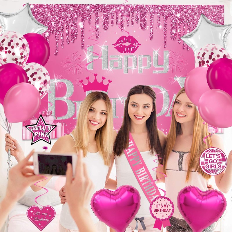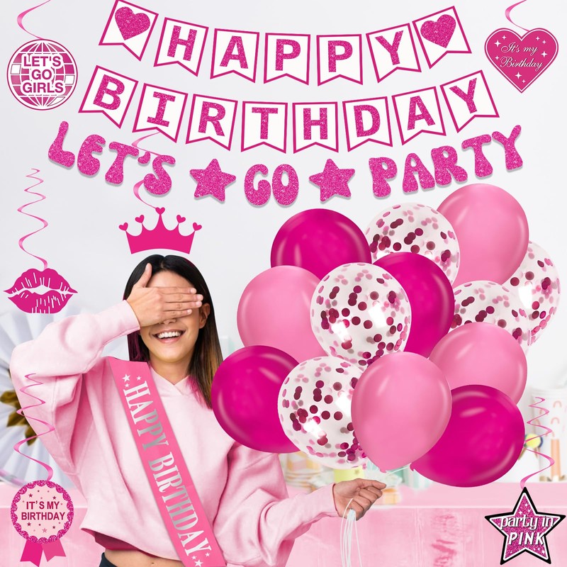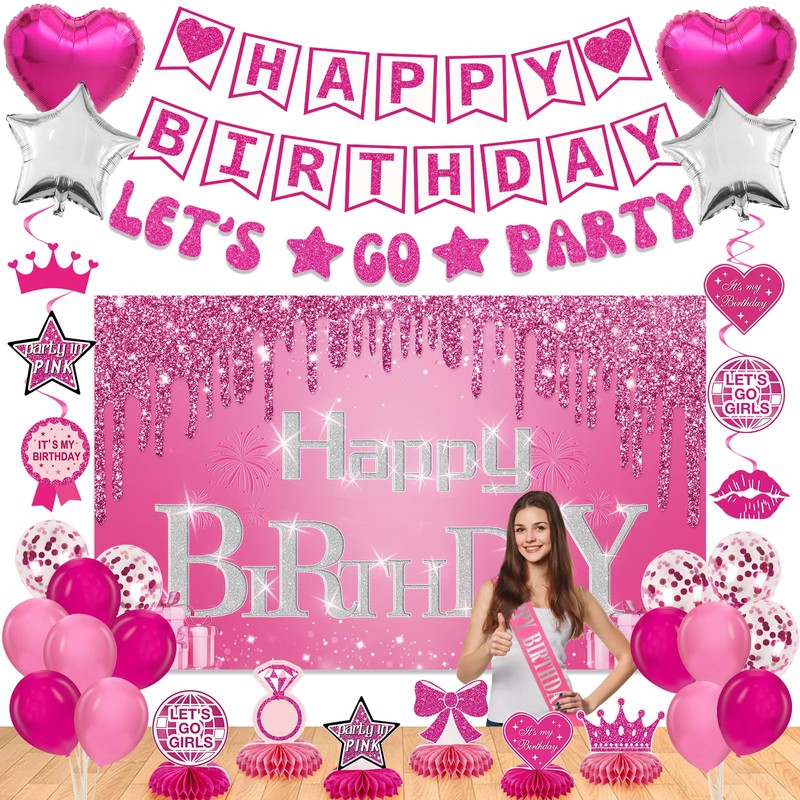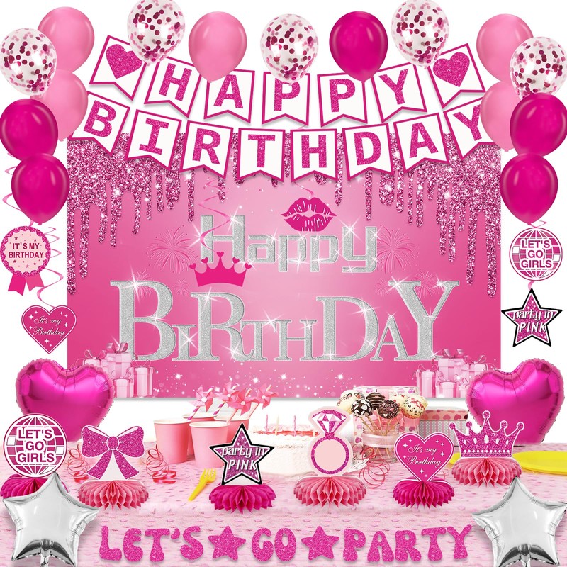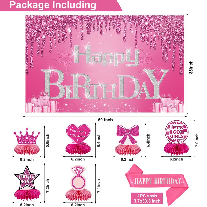 - Pink Party Decorations Kit:Don't miss them!If you want to throw a pink themed party for your families or friends,this pink birthday decorations set is great for a pink birthday party. It includes 1pc 35×59inch Banner Backdrop,10pcs 10inch with latex balloons(2 colors), 5pcs 12inch with sequin balloons, 4 large foil balloons,6pcs Hanging Swirl,1pc happy birthday banner,1pc LET'S GO PARTY banner,6pcs Honeycomb Centerpiece,1pc happy birthday sash.The rich and complete accessories can fully meet your needs.