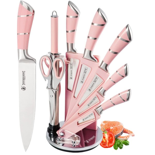 • 9-Pieces Pink Knives Set: This pink set of knives includes: Chef Knife, Slicing Knife, Bread Knife, Utility Knife, Fruit Knife,Knife Sharpener,Kitchen Scissors,Peeler,Rotary Knife Holder.This 9-piece kitchen knife set is widely used for cutting, slicing, shearing, chopping, and can meet your various cutting needs while cooking.