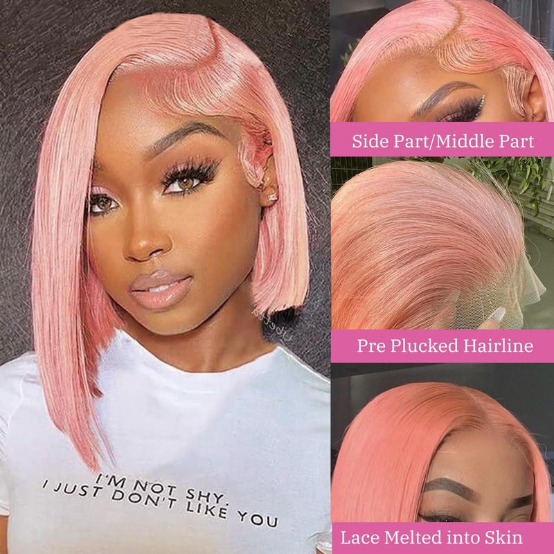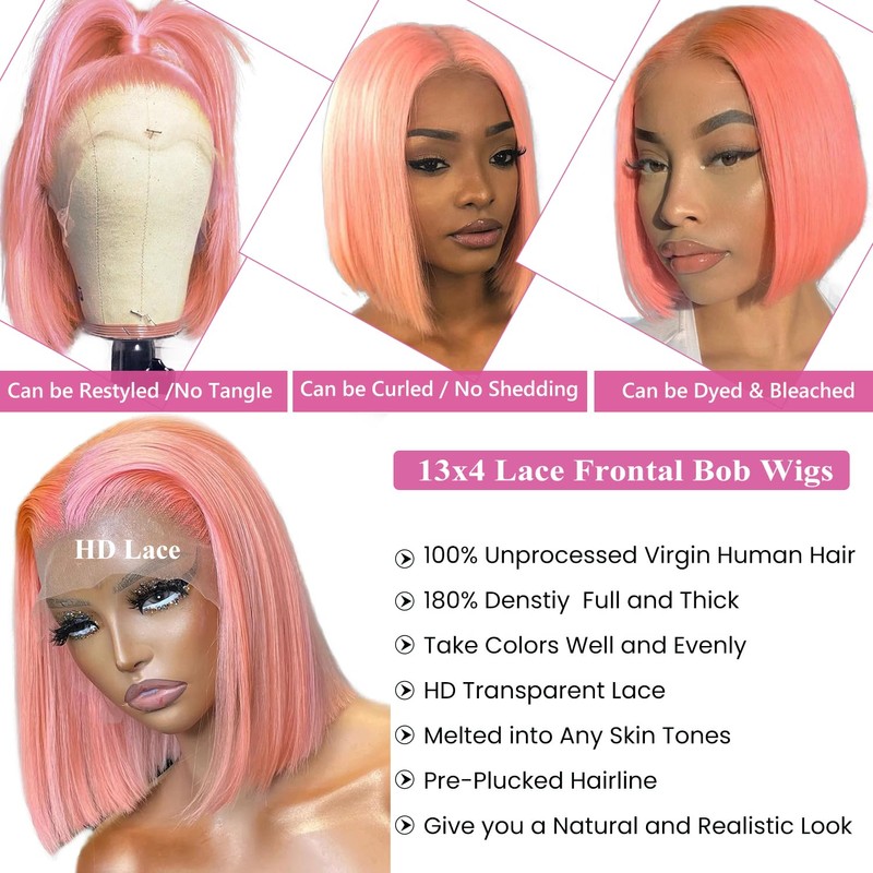 Pink Lace Front Bob Wig Human Hair, Gluleless 13x6 Lace Front Wigs Human Hair Pre Plucked 8 Inch Peach Pink Bob Wigs for Women 180% Density Slightly Bleachd Knots Swiss HD Lace Melted into Skin