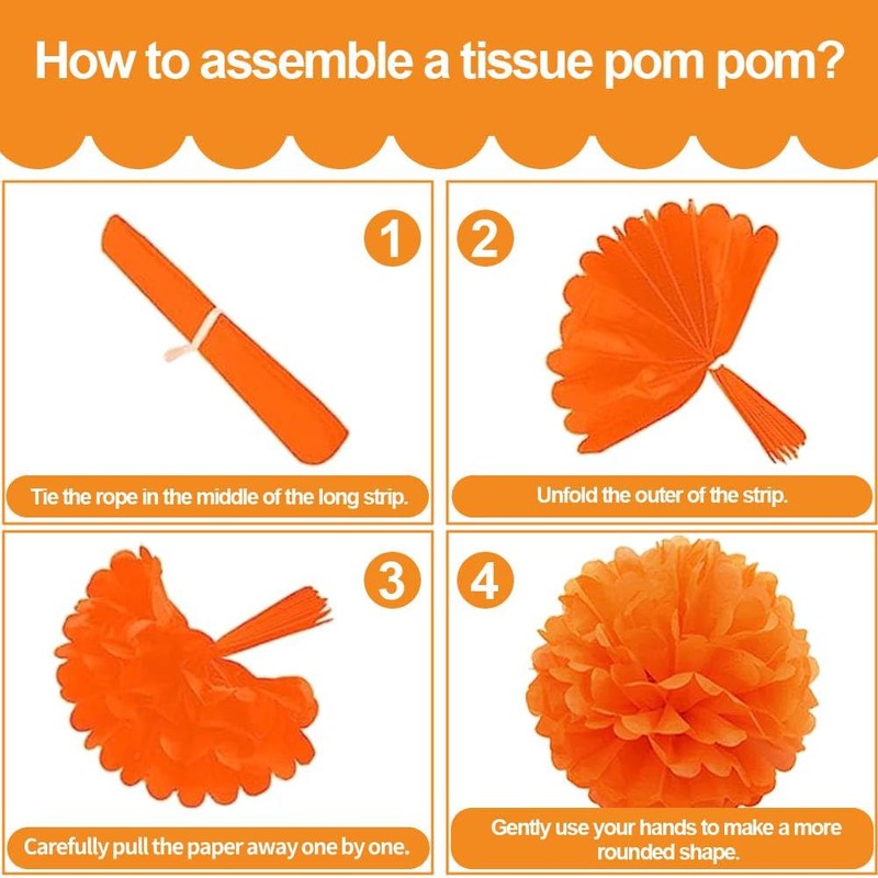 1.Tissue pom poms, lanterns and honeycomb ball are easy to collapse, please hang them carefully and it's better to hang them in a higher or safe place where people will not touch or press.